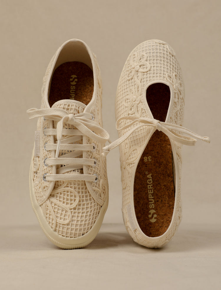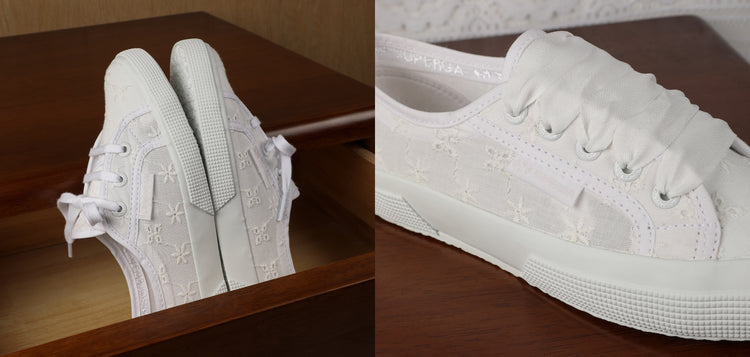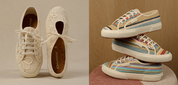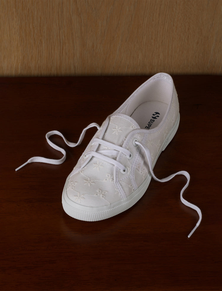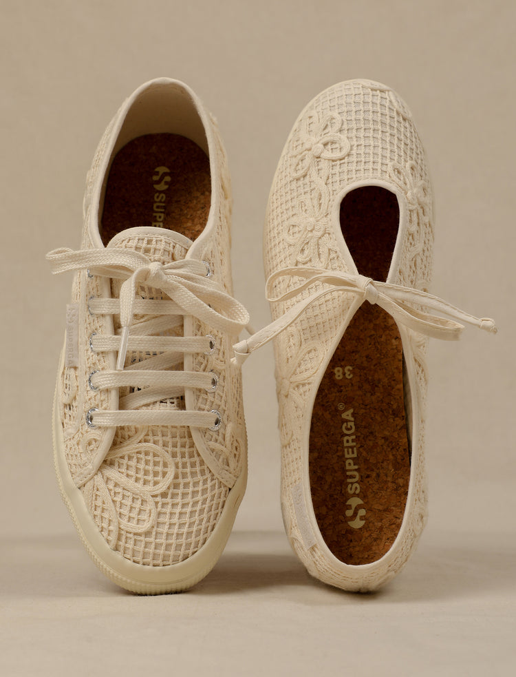 This ballerina silhouette is delicate and luminous thanks to its precious fabric. The sneaker reaffirms the Superga DNA, with a white vulcanized natural rubber sole and a sangallo cotton upper with internal organza lining. This makes the style ideal for the summer season and...