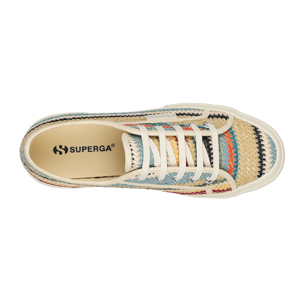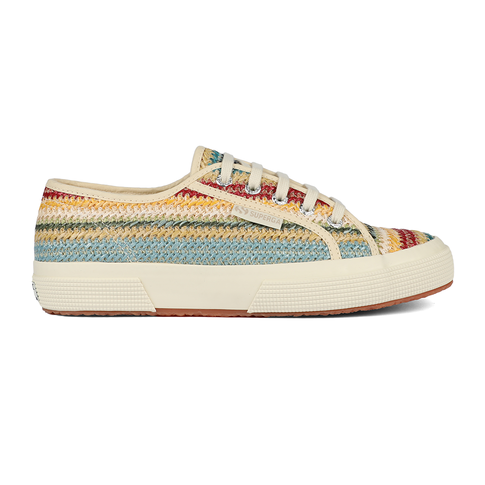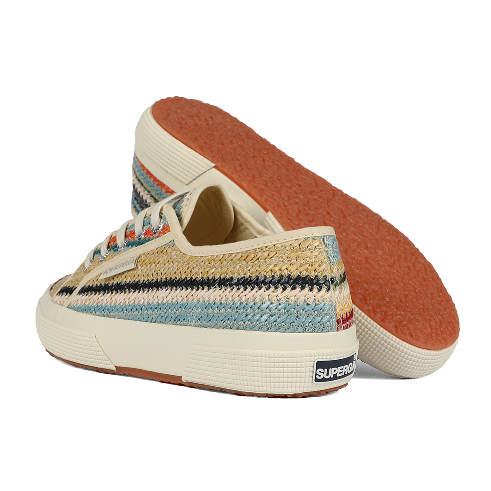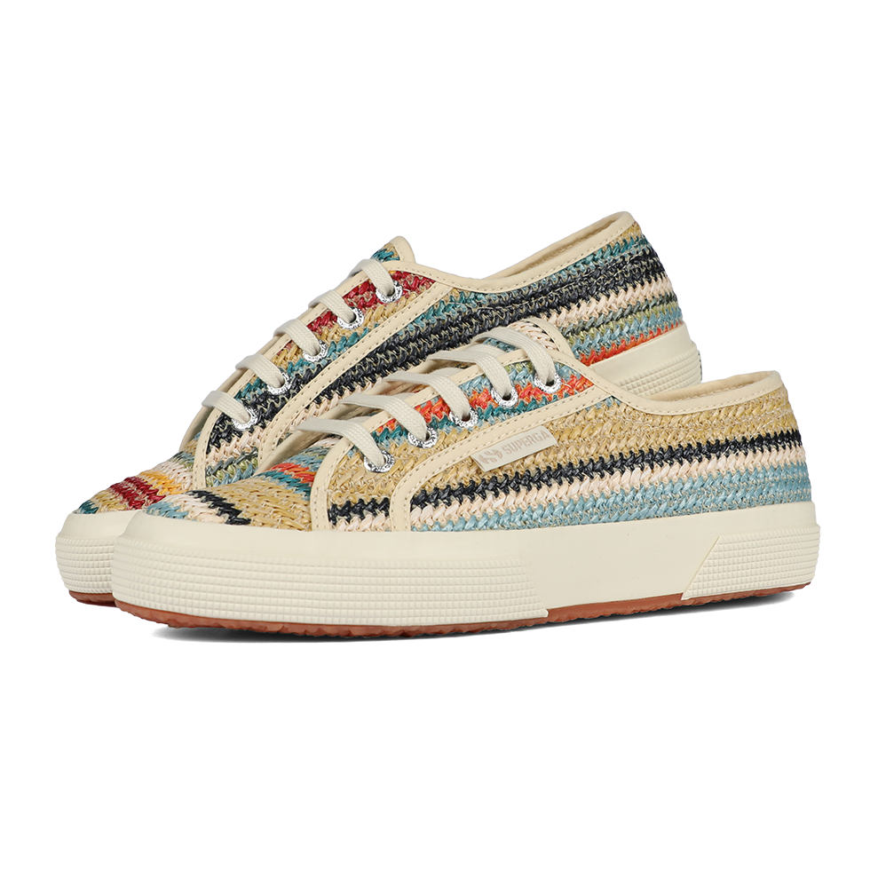A fresh take on the iconic Superga 2750, the lace-up sneaker features a woven raffia upper and a boho-inspired palette that adds a refined, upbeat twist to summer looks. The vulcanized rubber sole and signature side jacquard logo label remain true to the brand’s timeless codes.