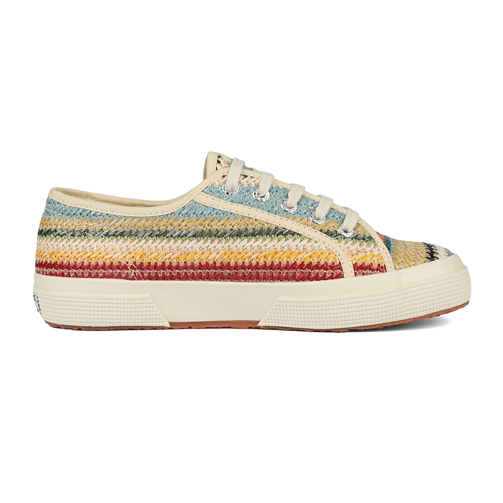 A fresh take on the iconic Superga 2750, the lace-up sneaker features a woven raffia upper and a boho-inspired palette that adds a refined, upbeat twist to summer looks. The vulcanized rubber sole and signature side jacquard logo label remain true to the brand’s timeless codes.