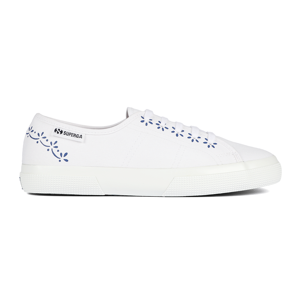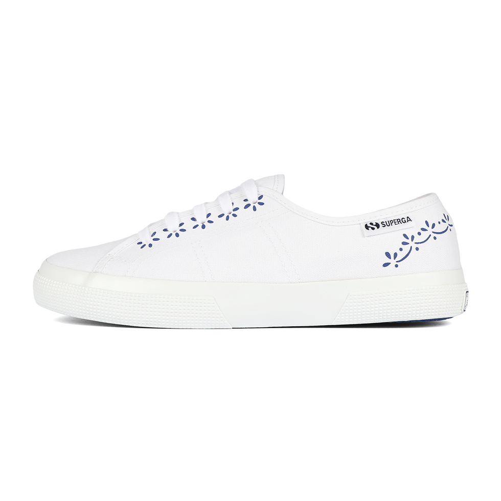 The newSuperga 3750 features an original lightweight construction and a high level of comfort. It maintains all the elements of the brand's lifestyle DNA. The shoes has a cotton upper, a flexible sole and a Memory Foam removable insole that perfectly adapts to the foot shape. The label turns blue, and the sole is made of white vulcanized natural rubber. The thin cotton upper with floral detail refers to traditional Italian ceramic.
