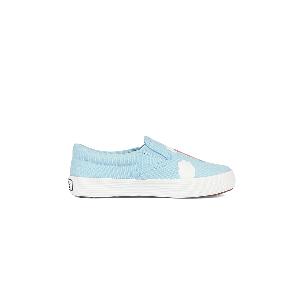 Boasting a serene sky blue upper and tonal Superga side tab, this junior slip-on sneaker features two separate motifs of Slimy posing with a heart-shaped friend amongst the clouds.